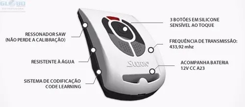 Controle Remoto: Resnstente Agua SultonRessonador SAW: (não perde a calibração).Resistente: à água.Sistema de codificação: code learning.3 botões em silicone.Frequência de transmissão: 433,92 MHz.