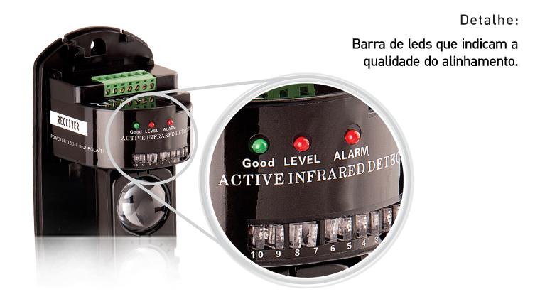 Barra de leds no receptor: para indicar a qualidade de alinhamento dos sensores